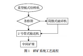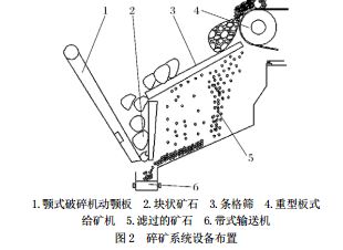 該礦碎礦系統工藝流程如圖1所示,設備布置如圖2所示,來料首先通過條格篩進行篩選。