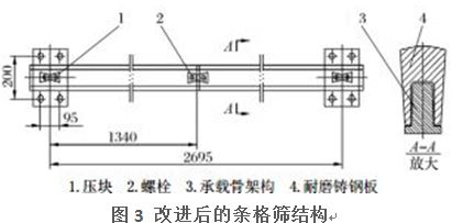 針對條格篩在生產中存在的問題,對格篩條進行了改進設計,改進后的條格篩主要由耐磨構件和承載骨架構件兩大部分組成,如圖3所示。